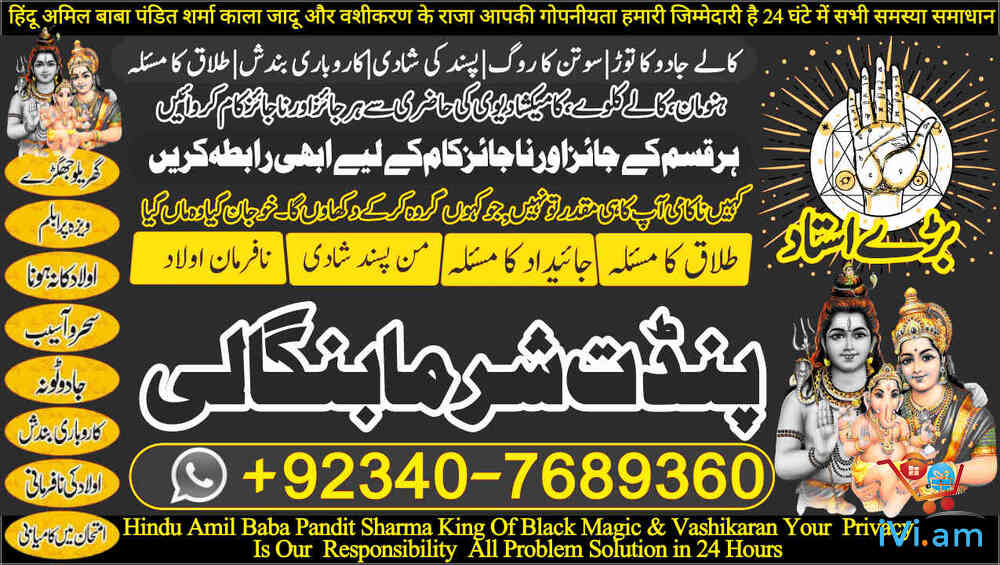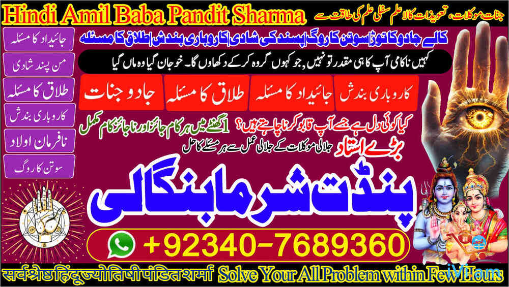 GLOBAL PRESENCE: Qatar, Canada, UK, USA, Norway, France, UAE (Dubai), Kenya, Fiji, Bahrain. PAKISTAN'S TRUSTED HEALER: Karachi, Lahore, Islamabad, Rawalpindi, and all major cities ,Seeking Permanent Solutions? With over 25 years of proven expertise, Pandit Sharma Ji is the internationally recognized authority in Authentic Kala Ilm, Rohani Amliyat, and Islamic Wazifa.📞 Call / WhatsApp for Immediate Consultation:+92 340 7689360 UAN: +92 340 7689360 Spiritual Field Expertise Kala Ilm & Jadu Removal & Protection Specialist Rohani Amliyat Authentic Spiritual Practices